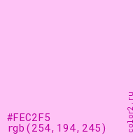 Цвет #FEC2F5 в цветовой модели RGB обозначается тремя октетами (254, 194, 245) в десятичном формате и #FEC2F5 в шестнадцатиричном (hex) формате, которые являются интенсивностью красного 254 (hex FE), интенсивность зелёного 194 (hex C2) и интенсивность синего 245 (hex F5).