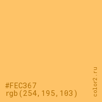Цвет #FEC367 в цветовой модели RGB обозначается тремя октетами (254, 195, 103) в десятичном формате и #FEC367 в шестнадцатиричном (hex) формате, которые являются интенсивностью красного 254 (hex FE), интенсивность зелёного 195 (hex C3) и интенсивность синего 103 (hex 67).