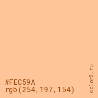 Цвет #FEC59A в цветовой модели RGB обозначается тремя октетами (254, 197, 154) в десятичном формате и #FEC59A в шестнадцатиричном (hex) формате, которые являются интенсивностью красного 254 (hex FE), интенсивность зелёного 197 (hex C5) и интенсивность синего 154 (hex 9A).