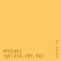 Цвет #FEC862 в цветовой модели RGB обозначается тремя октетами (254, 200, 98) в десятичном формате и #FEC862 в шестнадцатиричном (hex) формате, которые являются интенсивностью красного 254 (hex FE), интенсивность зелёного 200 (hex C8) и интенсивность синего 98 (hex 62).