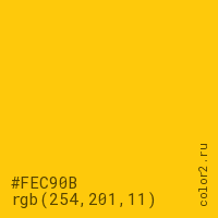 Цвет #FEC90B в цветовой модели RGB обозначается тремя октетами (254, 201, 11) в десятичном формате и #FEC90B в шестнадцатиричном (hex) формате, которые являются интенсивностью красного 254 (hex FE), интенсивность зелёного 201 (hex C9) и интенсивность синего 11 (hex 0B).