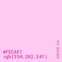 Цвет #FECAF1 в цветовой модели RGB обозначается тремя октетами (254, 202, 241) в десятичном формате и #FECAF1 в шестнадцатиричном (hex) формате, которые являются интенсивностью красного 254 (hex FE), интенсивность зелёного 202 (hex CA) и интенсивность синего 241 (hex F1).