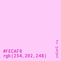 Цвет #FECAF8 в цветовой модели RGB обозначается тремя октетами (254, 202, 248) в десятичном формате и #FECAF8 в шестнадцатиричном (hex) формате, которые являются интенсивностью красного 254 (hex FE), интенсивность зелёного 202 (hex CA) и интенсивность синего 248 (hex F8).
