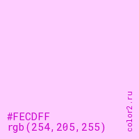 Цвет #FECDFF в цветовой модели RGB обозначается тремя октетами (254, 205, 255) в десятичном формате и #FECDFF в шестнадцатиричном (hex) формате, которые являются интенсивностью красного 254 (hex FE), интенсивность зелёного 205 (hex CD) и интенсивность синего 255 (hex FF).