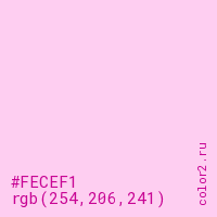 Цвет #FECEF1 в цветовой модели RGB обозначается тремя октетами (254, 206, 241) в десятичном формате и #FECEF1 в шестнадцатиричном (hex) формате, которые являются интенсивностью красного 254 (hex FE), интенсивность зелёного 206 (hex CE) и интенсивность синего 241 (hex F1).