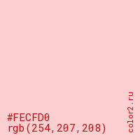 Цвет #FECFD0 в цветовой модели RGB обозначается тремя октетами (254, 207, 208) в десятичном формате и #FECFD0 в шестнадцатиричном (hex) формате, которые являются интенсивностью красного 254 (hex FE), интенсивность зелёного 207 (hex CF) и интенсивность синего 208 (hex D0).