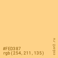 Цвет #FED387 в цветовой модели RGB обозначается тремя октетами (254, 211, 135) в десятичном формате и #FED387 в шестнадцатиричном (hex) формате, которые являются интенсивностью красного 254 (hex FE), интенсивность зелёного 211 (hex D3) и интенсивность синего 135 (hex 87).