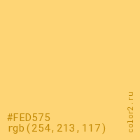 Цвет #FED575 в цветовой модели RGB обозначается тремя октетами (254, 213, 117) в десятичном формате и #FED575 в шестнадцатиричном (hex) формате, которые являются интенсивностью красного 254 (hex FE), интенсивность зелёного 213 (hex D5) и интенсивность синего 117 (hex 75).