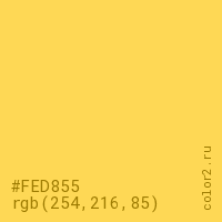 Цвет #FED855 в цветовой модели RGB обозначается тремя октетами (254, 216, 85) в десятичном формате и #FED855 в шестнадцатиричном (hex) формате, которые являются интенсивностью красного 254 (hex FE), интенсивность зелёного 216 (hex D8) и интенсивность синего 85 (hex 55).