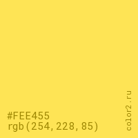 Цвет #FEE455 в цветовой модели RGB обозначается тремя октетами (254, 228, 85) в десятичном формате и #FEE455 в шестнадцатиричном (hex) формате, которые являются интенсивностью красного 254 (hex FE), интенсивность зелёного 228 (hex E4) и интенсивность синего 85 (hex 55).