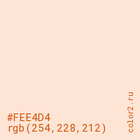 Цвет #FEE4D4 в цветовой модели RGB обозначается тремя октетами (254, 228, 212) в десятичном формате и #FEE4D4 в шестнадцатиричном (hex) формате, которые являются интенсивностью красного 254 (hex FE), интенсивность зелёного 228 (hex E4) и интенсивность синего 212 (hex D4).