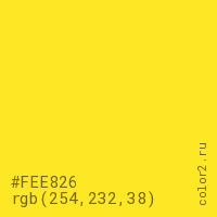 Цвет #FEE826 в цветовой модели RGB обозначается тремя октетами (254, 232, 38) в десятичном формате и #FEE826 в шестнадцатиричном (hex) формате, которые являются интенсивностью красного 254 (hex FE), интенсивность зелёного 232 (hex E8) и интенсивность синего 38 (hex 26).