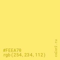 Цвет #FEEA70 в цветовой модели RGB обозначается тремя октетами (254, 234, 112) в десятичном формате и #FEEA70 в шестнадцатиричном (hex) формате, которые являются интенсивностью красного 254 (hex FE), интенсивность зелёного 234 (hex EA) и интенсивность синего 112 (hex 70).