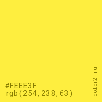 Цвет #FEEE3F в цветовой модели RGB обозначается тремя октетами (254, 238, 63) в десятичном формате и #FEEE3F в шестнадцатиричном (hex) формате, которые являются интенсивностью красного 254 (hex FE), интенсивность зелёного 238 (hex EE) и интенсивность синего 63 (hex 3F).