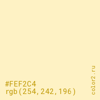Цвет #FEF2C4 в цветовой модели RGB обозначается тремя октетами (254, 242, 196) в десятичном формате и #FEF2C4 в шестнадцатиричном (hex) формате, которые являются интенсивностью красного 254 (hex FE), интенсивность зелёного 242 (hex F2) и интенсивность синего 196 (hex C4).