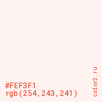 Цвет #FEF3F1 в цветовой модели RGB обозначается тремя октетами (254, 243, 241) в десятичном формате и #FEF3F1 в шестнадцатиричном (hex) формате, которые являются интенсивностью красного 254 (hex FE), интенсивность зелёного 243 (hex F3) и интенсивность синего 241 (hex F1).