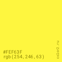Цвет #FEF63F в цветовой модели RGB обозначается тремя октетами (254, 246, 63) в десятичном формате и #FEF63F в шестнадцатиричном (hex) формате, которые являются интенсивностью красного 254 (hex FE), интенсивность зелёного 246 (hex F6) и интенсивность синего 63 (hex 3F).