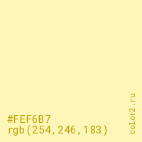 Цвет #FEF6B7 в цветовой модели RGB обозначается тремя октетами (254, 246, 183) в десятичном формате и #FEF6B7 в шестнадцатиричном (hex) формате, которые являются интенсивностью красного 254 (hex FE), интенсивность зелёного 246 (hex F6) и интенсивность синего 183 (hex B7).