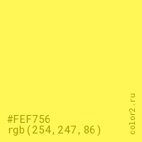 Цвет #FEF756 в цветовой модели RGB обозначается тремя октетами (254, 247, 86) в десятичном формате и #FEF756 в шестнадцатиричном (hex) формате, которые являются интенсивностью красного 254 (hex FE), интенсивность зелёного 247 (hex F7) и интенсивность синего 86 (hex 56).