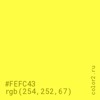Цвет #FEFC43 в цветовой модели RGB обозначается тремя октетами (254, 252, 67) в десятичном формате и #FEFC43 в шестнадцатиричном (hex) формате, которые являются интенсивностью красного 254 (hex FE), интенсивность зелёного 252 (hex FC) и интенсивность синего 67 (hex 43).