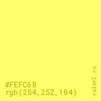 Цвет #FEFC68 в цветовой модели RGB обозначается тремя октетами (254, 252, 104) в десятичном формате и #FEFC68 в шестнадцатиричном (hex) формате, которые являются интенсивностью красного 254 (hex FE), интенсивность зелёного 252 (hex FC) и интенсивность синего 104 (hex 68).