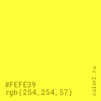 Цвет #FEFE39 в цветовой модели RGB обозначается тремя октетами (254, 254, 57) в десятичном формате и #FEFE39 в шестнадцатиричном (hex) формате, которые являются интенсивностью красного 254 (hex FE), интенсивность зелёного 254 (hex FE) и интенсивность синего 57 (hex 39).
