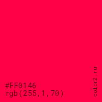 Цвет #FF0146 в цветовой модели RGB обозначается тремя октетами (255, 1, 70) в десятичном формате и #FF0146 в шестнадцатиричном (hex) формате, которые являются интенсивностью красного 255 (hex FF), интенсивность зелёного 1 (hex 01) и интенсивность синего 70 (hex 46).