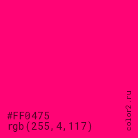 Цвет #FF0475 в цветовой модели RGB обозначается тремя октетами (255, 4, 117) в десятичном формате и #FF0475 в шестнадцатиричном (hex) формате, которые являются интенсивностью красного 255 (hex FF), интенсивность зелёного 4 (hex 04) и интенсивность синего 117 (hex 75).