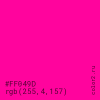 Цвет #FF049D в цветовой модели RGB обозначается тремя октетами (255, 4, 157) в десятичном формате и #FF049D в шестнадцатиричном (hex) формате, которые являются интенсивностью красного 255 (hex FF), интенсивность зелёного 4 (hex 04) и интенсивность синего 157 (hex 9D).