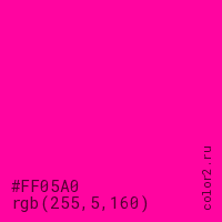 Цвет #FF05A0 в цветовой модели RGB обозначается тремя октетами (255, 5, 160) в десятичном формате и #FF05A0 в шестнадцатиричном (hex) формате, которые являются интенсивностью красного 255 (hex FF), интенсивность зелёного 5 (hex 05) и интенсивность синего 160 (hex A0).