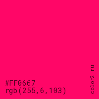 Цвет #FF0667 в цветовой модели RGB обозначается тремя октетами (255, 6, 103) в десятичном формате и #FF0667 в шестнадцатиричном (hex) формате, которые являются интенсивностью красного 255 (hex FF), интенсивность зелёного 6 (hex 06) и интенсивность синего 103 (hex 67).
