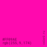 Цвет #FF09AE в цветовой модели RGB обозначается тремя октетами (255, 9, 174) в десятичном формате и #FF09AE в шестнадцатиричном (hex) формате, которые являются интенсивностью красного 255 (hex FF), интенсивность зелёного 9 (hex 09) и интенсивность синего 174 (hex AE).