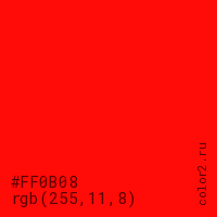 Цвет #FF0B08 в цветовой модели RGB обозначается тремя октетами (255, 11, 8) в десятичном формате и #FF0B08 в шестнадцатиричном (hex) формате, которые являются интенсивностью красного 255 (hex FF), интенсивность зелёного 11 (hex 0B) и интенсивность синего 8 (hex 08).