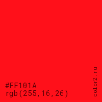 Цвет RGB(255, 16, 26) в процентом отношении количества цвета состоит из 100% красного (red), 6.3% зелёного (green) и 10.2% синего (blue).