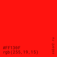 Цвет #FF130F в цветовой модели RGB обозначается тремя октетами (255, 19, 15) в десятичном формате и #FF130F в шестнадцатиричном (hex) формате, которые являются интенсивностью красного 255 (hex FF), интенсивность зелёного 19 (hex 13) и интенсивность синего 15 (hex 0F).