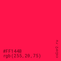 Цвет #FF144B в цветовой модели RGB обозначается тремя октетами (255, 20, 75) в десятичном формате и #FF144B в шестнадцатиричном (hex) формате, которые являются интенсивностью красного 255 (hex FF), интенсивность зелёного 20 (hex 14) и интенсивность синего 75 (hex 4B).