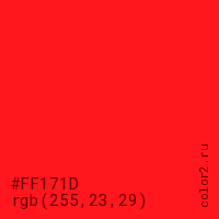 Цвет #FF171D в цветовой модели RGB обозначается тремя октетами (255, 23, 29) в десятичном формате и #FF171D в шестнадцатиричном (hex) формате, которые являются интенсивностью красного 255 (hex FF), интенсивность зелёного 23 (hex 17) и интенсивность синего 29 (hex 1D).