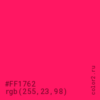 Цвет #FF1762 в цветовой модели RGB обозначается тремя октетами (255, 23, 98) в десятичном формате и #FF1762 в шестнадцатиричном (hex) формате, которые являются интенсивностью красного 255 (hex FF), интенсивность зелёного 23 (hex 17) и интенсивность синего 98 (hex 62).
