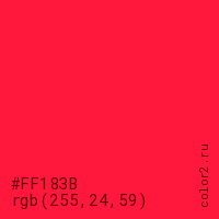 Цвет RGB(255, 24, 59) в процентом отношении количества цвета состоит из 100% красного (red), 9.4% зелёного (green) и 23.1% синего (blue).