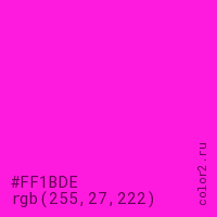 Цвет #FF1BDE в цветовой модели RGB обозначается тремя октетами (255, 27, 222) в десятичном формате и #FF1BDE в шестнадцатиричном (hex) формате, которые являются интенсивностью красного 255 (hex FF), интенсивность зелёного 27 (hex 1B) и интенсивность синего 222 (hex DE).