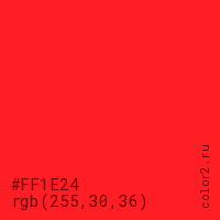 Цвет #FF1E24 в цветовой модели RGB обозначается тремя октетами (255, 30, 36) в десятичном формате и #FF1E24 в шестнадцатиричном (hex) формате, которые являются интенсивностью красного 255 (hex FF), интенсивность зелёного 30 (hex 1E) и интенсивность синего 36 (hex 24).