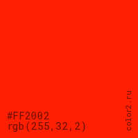 Цвет #FF2002 в цветовой модели RGB обозначается тремя октетами (255, 32, 2) в десятичном формате и #FF2002 в шестнадцатиричном (hex) формате, которые являются интенсивностью красного 255 (hex FF), интенсивность зелёного 32 (hex 20) и интенсивность синего 2 (hex 02).