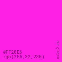 Цвет #FF20E6 в цветовой модели RGB обозначается тремя октетами (255, 32, 230) в десятичном формате и #FF20E6 в шестнадцатиричном (hex) формате, которые являются интенсивностью красного 255 (hex FF), интенсивность зелёного 32 (hex 20) и интенсивность синего 230 (hex E6).