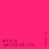 Цвет #FF2176 в цветовой модели RGB обозначается тремя октетами (255, 33, 118) в десятичном формате и #FF2176 в шестнадцатиричном (hex) формате, которые являются интенсивностью красного 255 (hex FF), интенсивность зелёного 33 (hex 21) и интенсивность синего 118 (hex 76).