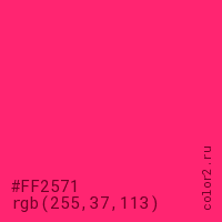 Цвет #FF2571 в цветовой модели RGB обозначается тремя октетами (255, 37, 113) в десятичном формате и #FF2571 в шестнадцатиричном (hex) формате, которые являются интенсивностью красного 255 (hex FF), интенсивность зелёного 37 (hex 25) и интенсивность синего 113 (hex 71).