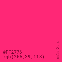 Цвет #FF2776 в цветовой модели RGB обозначается тремя октетами (255, 39, 118) в десятичном формате и #FF2776 в шестнадцатиричном (hex) формате, которые являются интенсивностью красного 255 (hex FF), интенсивность зелёного 39 (hex 27) и интенсивность синего 118 (hex 76).