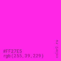 Цвет #FF27E5 в цветовой модели RGB обозначается тремя октетами (255, 39, 229) в десятичном формате и #FF27E5 в шестнадцатиричном (hex) формате, которые являются интенсивностью красного 255 (hex FF), интенсивность зелёного 39 (hex 27) и интенсивность синего 229 (hex E5).