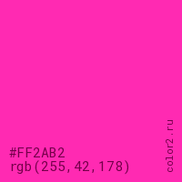 Цвет #FF2AB2 в цветовой модели RGB обозначается тремя октетами (255, 42, 178) в десятичном формате и #FF2AB2 в шестнадцатиричном (hex) формате, которые являются интенсивностью красного 255 (hex FF), интенсивность зелёного 42 (hex 2A) и интенсивность синего 178 (hex B2).