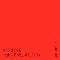 Цвет #FF2F26 в цветовой модели RGB обозначается тремя октетами (255, 47, 38) в десятичном формате и #FF2F26 в шестнадцатиричном (hex) формате, которые являются интенсивностью красного 255 (hex FF), интенсивность зелёного 47 (hex 2F) и интенсивность синего 38 (hex 26).