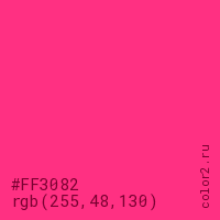 Цвет #FF3082 в цветовой модели RGB обозначается тремя октетами (255, 48, 130) в десятичном формате и #FF3082 в шестнадцатиричном (hex) формате, которые являются интенсивностью красного 255 (hex FF), интенсивность зелёного 48 (hex 30) и интенсивность синего 130 (hex 82).